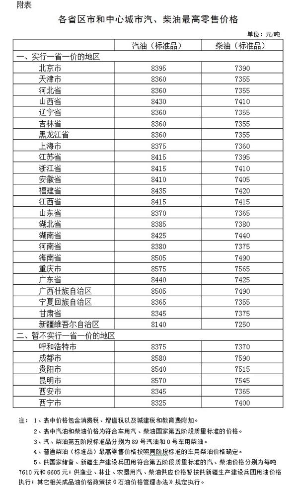 附:各省区市和中心城市汽、柴油最高零售价格