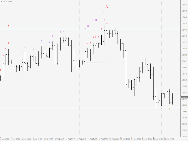 Magic Bar Combination Qualifier is better when you have sharp directional moves, because it requires only thirteen price bars from start to finish compared to Magic Bar Qualifier which needs at least 22 bars. The criterias for a Ninth Bar Signal are the same with those required for a Magic Bar Qualifier. The difference is that the count starts at bar 1 of the Ninth Bar Settings and not from bar nine and Magic Bar Combination Qualifier requires four conditions to be satisfied simultaneously.