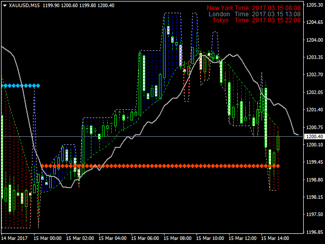 The first part informs the trader about the open or closed state of the trading session of three currency markets (New York, London and Tokyo). The current time for these exchanges is determined based on the local time of your PC with consideration of the time difference. The national holidays and memorial days are also considered non-operational. Their dates are taken from the official sites of the corresponding exchanges from April 1 to December 29, 2017. This indicator block can be enabled or disabled using an input parameter. If the block is enabled, the current time for each exchange will be shown in the top right corner. If the clock is displayed in red, then the trading session is closed in the respective market.