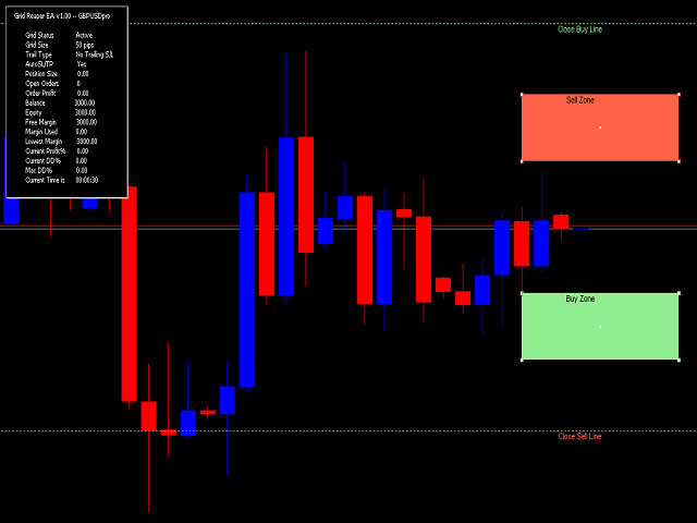 Zones are defined as areas where trades(market orders) are allowed to happen. They are the green box (longs) and red box (shorts)...only their trade types may trigger within their respective zone. Both can overlap in order to hedge if your broker allows it. A "CloseBuyLine" and "CloseSellLine" are also available. These will close all their open orders once price crosses those lines. These interactive objects can be used within the Strategy Tester in order to open and close orders manually. This can be very useful for testing your own manual strategies within the Strategy Tester environment. If a single order of a specific type is desired, a trader can resize the zone box to make it very narrow and widen the grid spacing to beyond the zone box.
