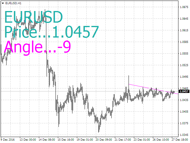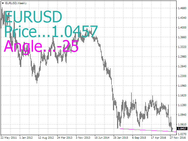 Visually, a line slope angle may not correspond to a numeric value since the angle calculation is not tied to the price chart scale. This happens due to the fact that auto scaling does not consider vertical and horizontal aspect ratio when forming a price chart. Therefore, the price chart displays the current estimated line's slope angle value and the current sell price for more convenience. The angle numerical value does not change if the chart scale is altered allowing you to receive a stable buy or sell signal.
