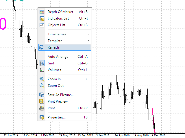 Download all available quote history before launching or testing. After downloading history, quote history display should be changed on all timeframes (including MN). See the screenshot for details. Launch the indicator only after the history is downloaded. The indicator issues a warning in case of insufficient history data.