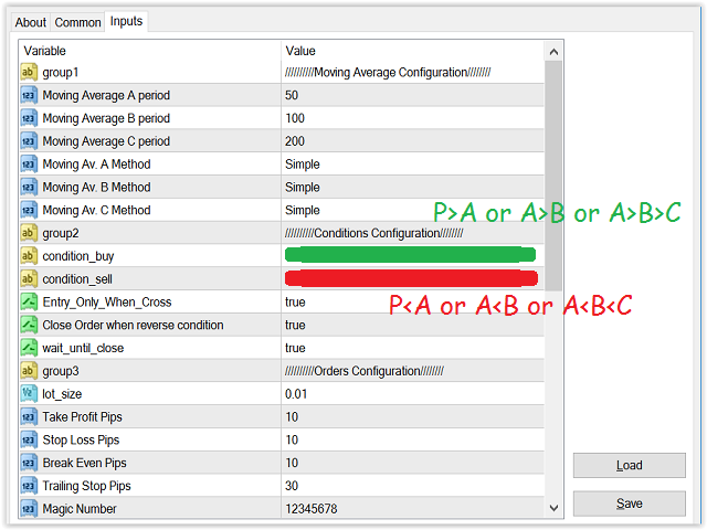 - Crossing three Moving Averages: When the fast MA has crossed the other two slower MA's in the same direction, the order is activated (buy code: "A>B>C" sell code: "A<B<C").