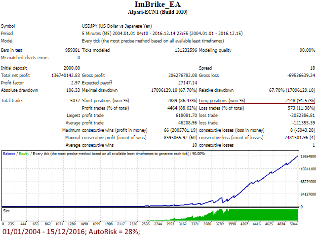 The ImBrike Expert Advisor is a trading system based on breakout and slope of trend indicators. Smart closing of orders is possible under three conditions: by indicators, by TakeProfit or StopLoss. False trades can be filtered using a system of filters, such as the trend filter based on CCI, daily volatility ratio and divergence of trend indicators.