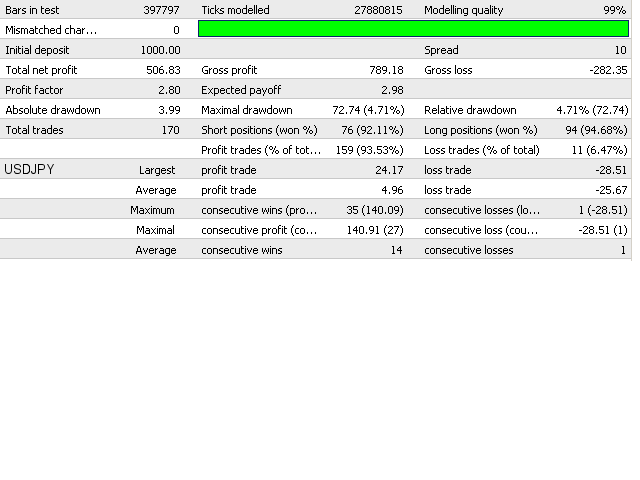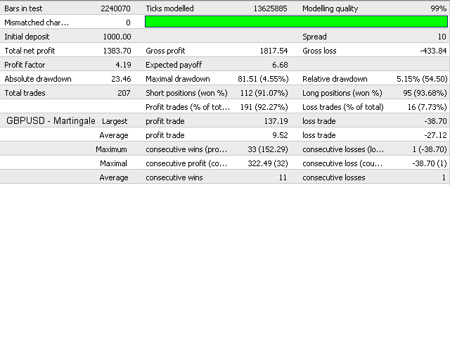 The present version, with default settings, is most efficient on GBPUSD, USDJPY and EURUSD pairs, provided that the spread is not larger than 2 pips.