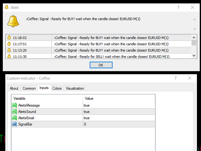 - alertsMessage - Text message about readiness to open a trade. This parameter is enabled by default (true).
