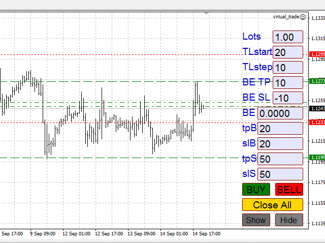The "VIRTUAL Trade Panel" is designed for virtual management of any number of orders. To manage orders, you can use StopLoss, TakeProfit, TrailingStop, BreakEvenStopLoss and BreakEvenTakeProfit. You can change all the input parameters on the panel at any time. The values of the input parameters are unchanged when switching chart timeframes and when hiding the panel with the "Hide" button. When the chart or terminal is closed, they are reset to the default values.