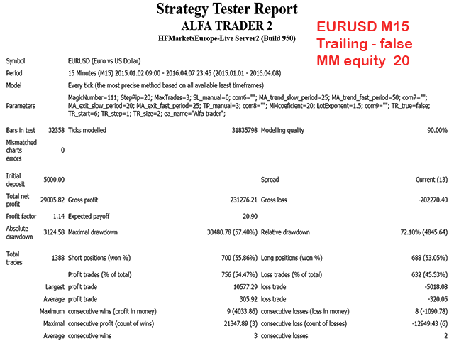AlfaTrader is a trend trading robot that can work on a real account at any broker with any order execution method. It can be used on different currency pairs.