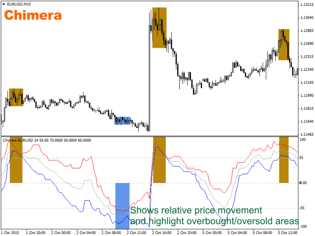The "areas of chimeras", also known as the attic and the basement, allow you to define the oversold/overbought areas and possible price reversal levels. These are levels 55 and -55 (the values are customizable). "When the price enters the areas of chimeras, it is devoured by a chimera causing slowing or even reversal. But the chimera always tries to deceive traders. Sometimes, the price side movements occur along the chimeras area without leaving them for a long time."