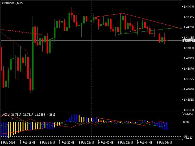Just like in the ADX, the indicator window has a red –DI line, a green +DI line and the main line of the indicator as a histogram or a yellow and blue line.