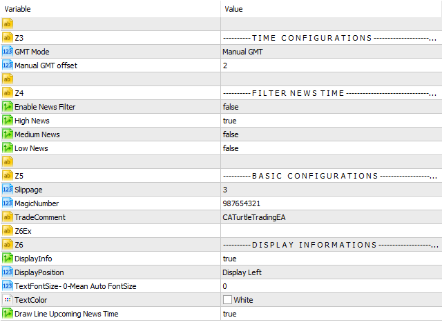 - EnableNewsFilter: To enable News Stop Trading (does not work in tester!).