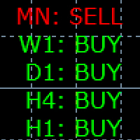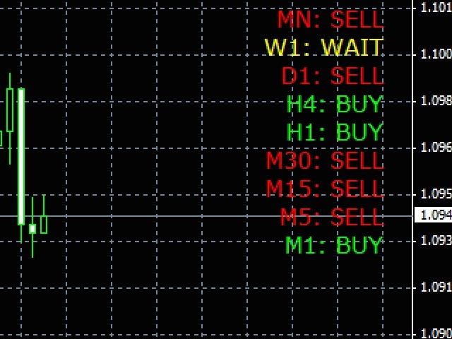 The indicator shows the current candle status of each timeframe on a single chart – either it is Bullish (BUY) or Bearish (SELL).