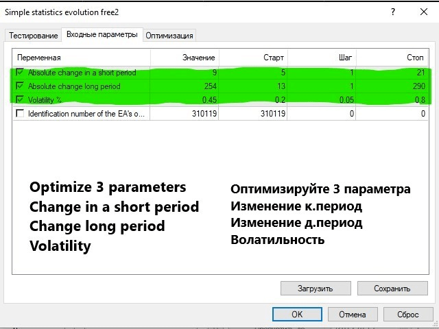 Диапазон оптимизации параметров периода расчета изменений (20-300), волатильность % (0.2-0.8).