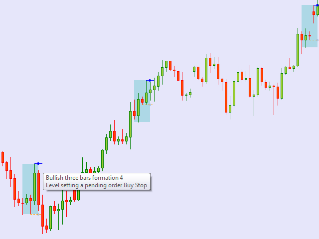 Three-bar formations often point to medium- or short-term reversals. Like any Price Action patterns, the detected patterns should be confirmed by other criteria.