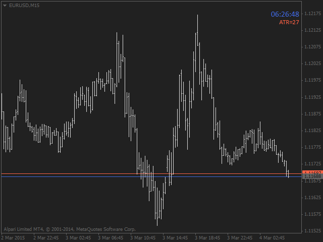 The indicator shows the server time and the value of the ATR indicator. It is possible to change the location and color of the text, as well as the settings of the ATR indicator.