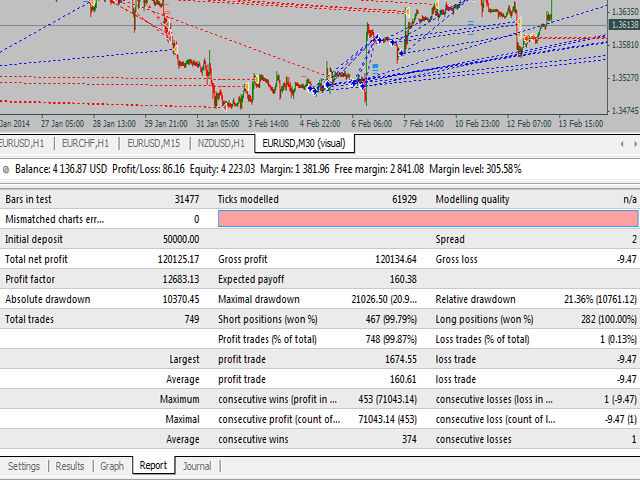 Originally positions are opened without stops. once a signal of a rollback is received, stops of profitable positions are set at the breakeven level set in the settings, and all of them are closed half the initial lot. The remaining positions are used to for restrain drawdown which may appear on opposite positions. Stops of a part of profitable positions are trailed till the complete position closing.