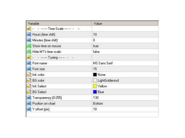 The indicator draws the time scale on the chart. You can specify the time offset for the scale, adjust the size and font to display on the chart.