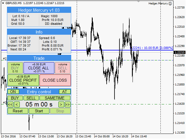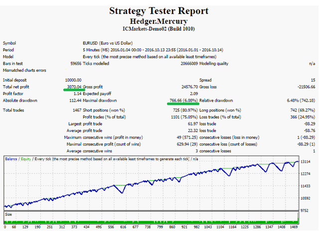 The Mercury Hedger EA is a trend scalper EA with elements of hedging. The standard parameters are optimized for trading the EURUSD M5 currency pair with the deposit of $10,000. The minimum deposit is $1000, provided the use of the starting lot of 0.01.