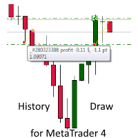 The indicator displays all deals in the chart, as well as adds the information about the deal result in the deposit currency and points in comments to deals.