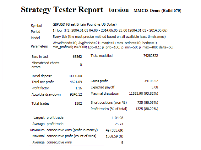 Testing on GBPUSD, Timeframe H1. Testing interval 2004.01.01-2014.08.17. Version of the test without hedging.