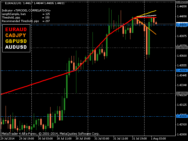 Of all the possible instruments (20), the indicator selects instruments that correlate best with the current chart symbol using a correlation coefficient. Then, after the last breaking point, it draws dynamics of correlated symbols as three beams of different colors.