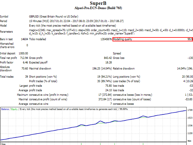 The demo version of the SuperB Expert Advisor. It trades based on an original algorithm with the use of standard indicators. The divergence of two technical indicators (MACD and CCI) is used as the main criterion for taking the trade decisions. The presented demo version of the EA has a limitation on the maximum profit taken from each trade, which cannot exceed $0.1.