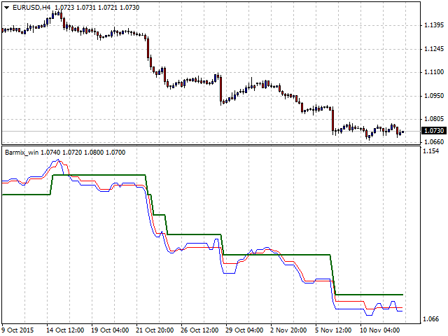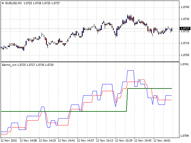 The indicator detects trends and reveals levels of interaction between buyers and sellers. It contains no settings and displays only three lines for a conclusive visualization of the current moment. The line #2 shows the global trend. If the remaining two lines are above the mentioned one, an up trend is probably forming. Otherwise, we should look for good points to sell (the red line crosses the blue one downwards). Buy when the blue line crosses the red one upwards, while the line #2 is below that crossing.