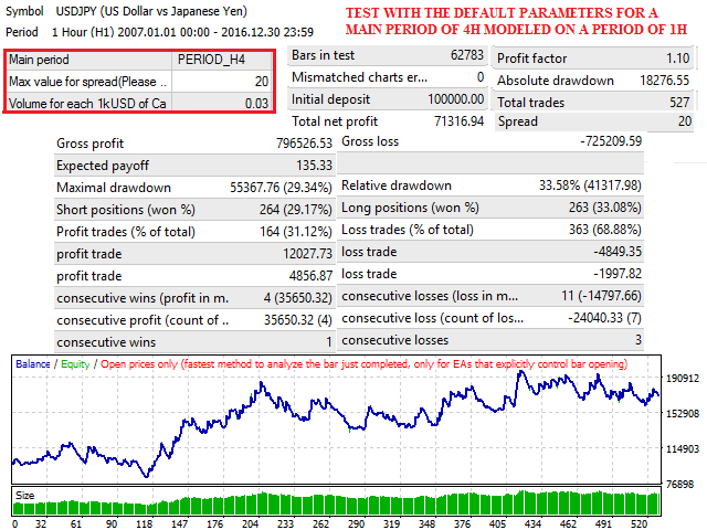 important: The values of the input parameters that come by default in the Expert Advisor are optimized with the historical data of the last 10 years for EUR / USD with 5 decimals in Main Period of 240 minutes. When you use this EA you should be aware that these results are no guarantee of success in the future and that no one but yourself is responsible for any decision or investment you make in the market.