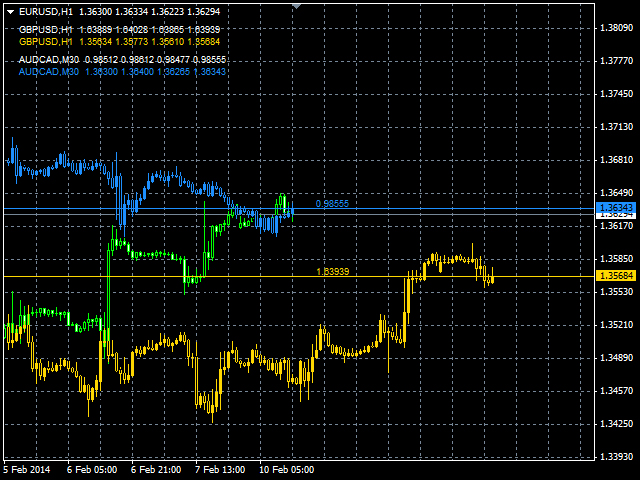 The indicator allows traders to apply any symbol and timeframe chart to the current one (so that two or more charts are displayed in a single window).