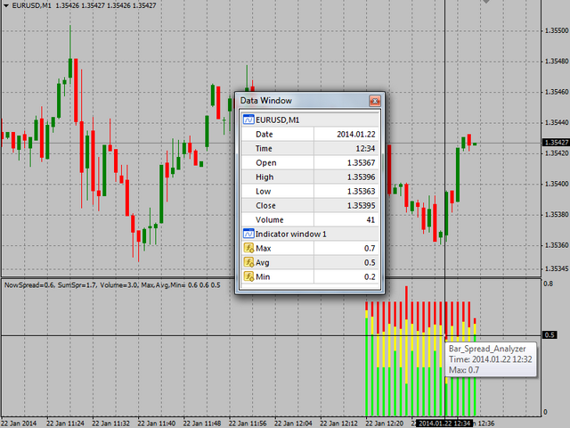 The indicator displays maximum, minimum and average spread for each bar of the timeframe it is applied to. The spreads are displayed in the form of a histogram. For the current bar it also displays the last (current) spread, the sum of all spreads and their number. Data for each closed bar is saved in a file on the first tick of the next bar (or the current bar in case the indicator/terminal is restarted), so when the terminal is restarted the data is loaded back.