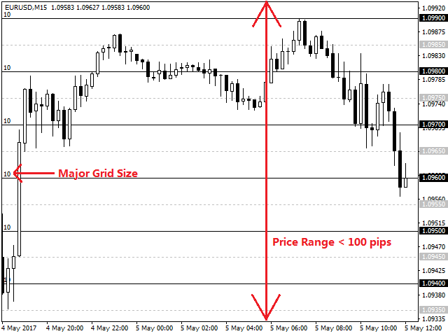This utility adjusts the grid size automatically according to the price range of the main chart. It will redraw the grids whenever the price range changes. Please refer to the screenshots for the preset major grid size at a different price range. Minor grid size is always set at half of the major grid size.