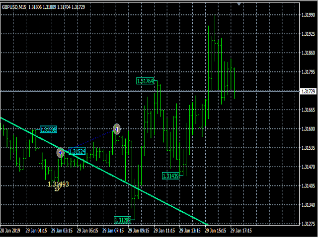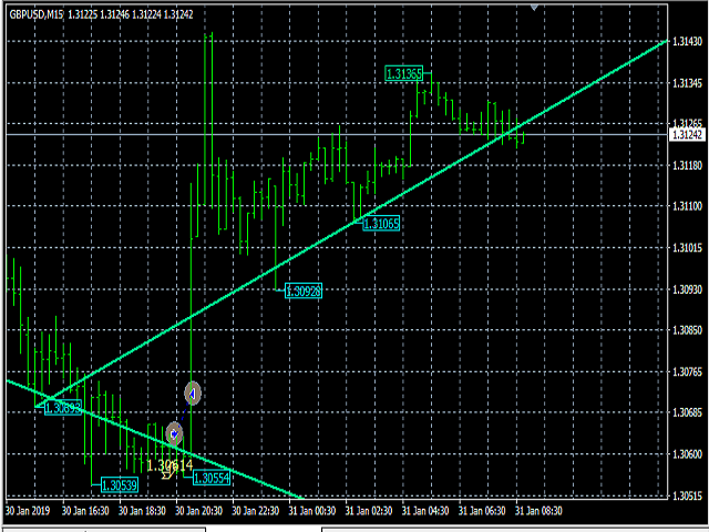 Советник ищет более точные сигналы на разворотах мульти-трендов, открывает сделки BUY или SELL, если выходит сигнал в виде стрелки на графике.
