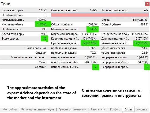 Советник сам открывает, удерживает и закрывает позиции, вам нужно выбрать только объем позиции. Количество сделок и время удержания позиции зависит от периода рабочего графика и состояния рынка (среднесрочная торговля).
