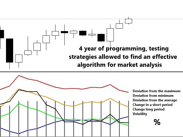 Оригинальный алгоритм. Соотношение отклонений от максимума/минимума показывает направление торговли. Проценты волатильности,