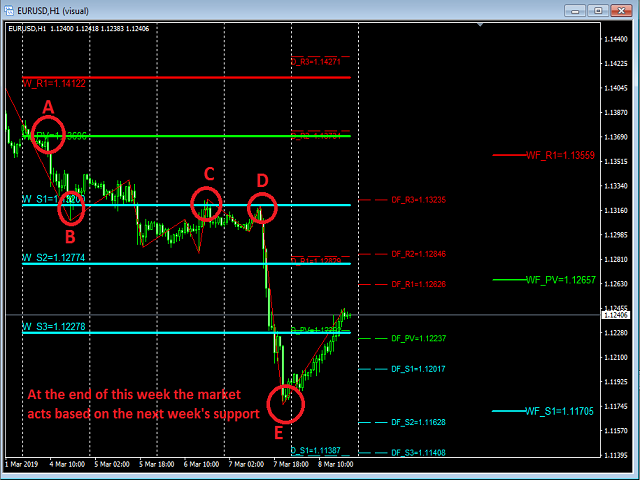 The third picture is about weekly pivots. It shows that at the first 4 days of this week, the market acts based on current week’s pivot and support lines (“A” & “B” & “C” & “D” points). But at the end of 4 th day and also at the 5 th day of the week, the market doesn't act based on this week’s pivot levels anymore and changes it’s direction from bearish to bullish from a point (“E” point) which you can't find any pivot level, because there is Weekly Future Support (WF_S1) line.