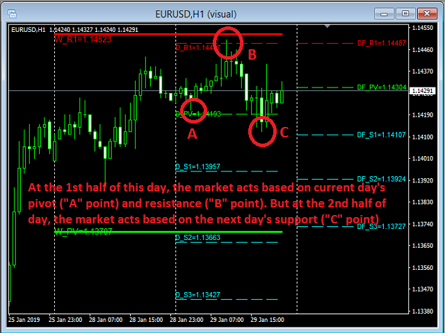 The second picture shows that at the first half of day, the market acts based on current day’s pivot and resistance levels and it changes it’s direction at these levels, but at the second half of the day, the market ignores current day’s pivot level and crosses it easily and also changes it’s direction from a point (“C” point) that you can't find any support level there. Because there is Daily Future support (DF_S1) line.