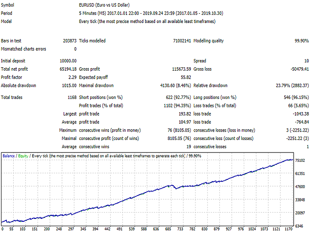 The Expert was tested with historical M5 period in EURUSD with exceptional results. You can download the demo and test it yourself.