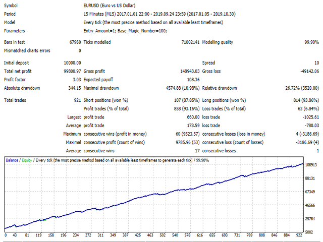 The Expert was tested with historical M15 period in EURUSD with exceptional results. You can download the demo and test it yourself.