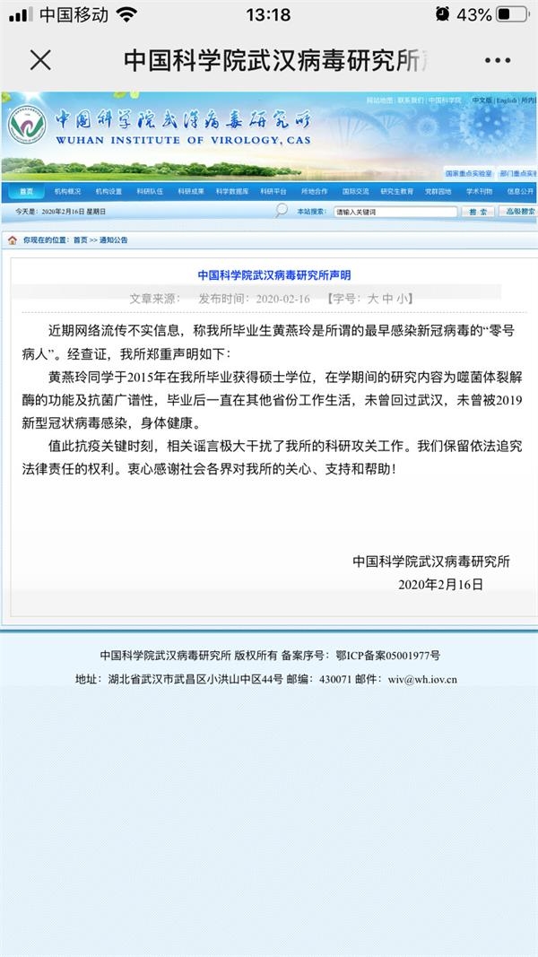 武汉病毒所研究生为“零号病人”?官方回应 _ 东方财富网