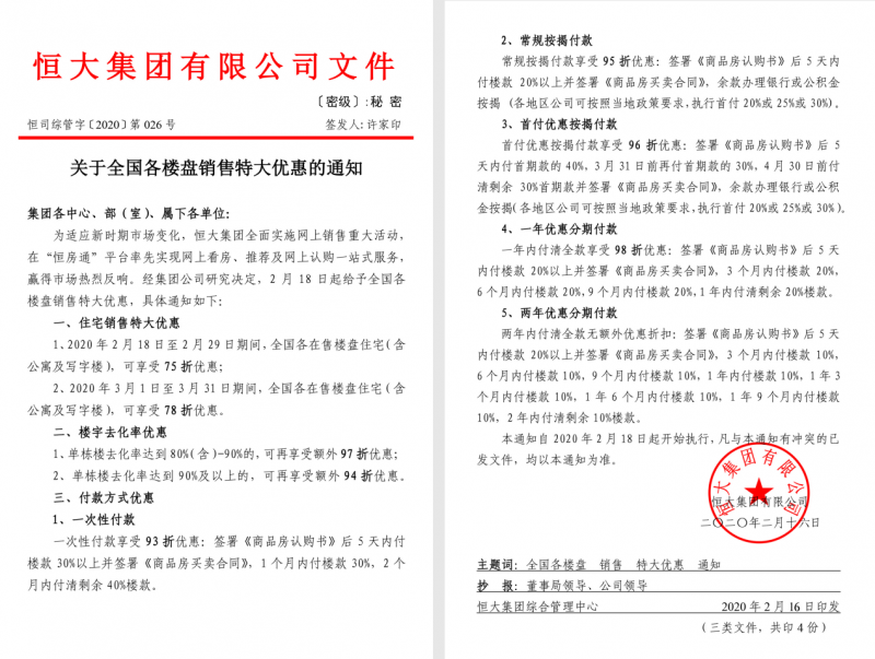 疫情下许家印打响“打折第一枪”!恒大内部文件:全国楼盘75折 _ 东方财富网