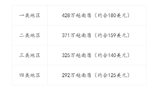 2019年越南官方数据显示越南最低工资标准(月薪)如下: