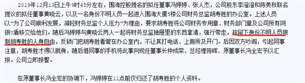 近日,位于浙江省宁波市鄞州区广贤路1009号围海大厦5楼,浙江省围海建设集团股份有限公司(下称“围海股份”)财务总监胡寿胜办公室内发生了匪夷所思的一幕。该公司实控人、原董事长冯全宏的女儿冯婷婷带着多位董事及一位陌生人将公司公章和财务章一起抢走,同时限制财务总监胡寿胜及印章保管员刘芳的人生自由。