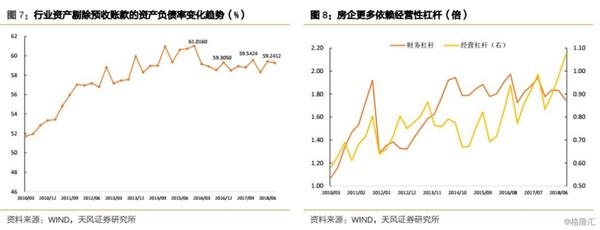 房地产行业剔除预收账款的资产负债率近三年较为稳定,房企更多依赖经营性杠杆。从剔除预收账款的资产负债率来看,行业杠杆率近三年相对较为稳定,相较于2015年末的剔除预收账款的资产负债率还有所下。在16年底房地产行业融资收紧以来,房企更加依赖于经营杠杆,而财务杠杆则相对稳定。