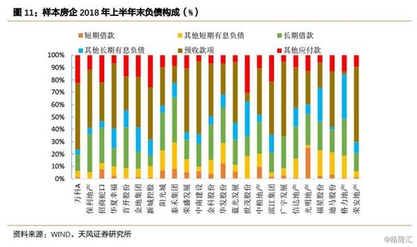 格力地产、泰禾、福星股份有息负债比重占比较高,万科、荣安不到30%。从2018年上半年末负债构成来看,24家重点房企中荣安地产、光宇发展、中南建设、万科预收款项占比较高,泰禾和华发短期有息负债占比较大。