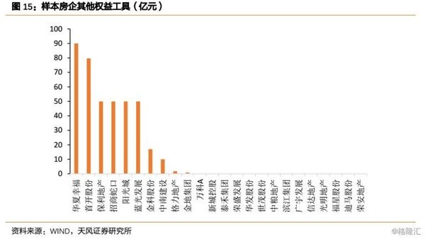 从房企其他权益工具的情况来看,华夏幸福和首开股份存量金额较大。表内负债还有一部分记在权益里,体现为其它权益工具,包括永续债(可续期委托贷款、永续债券)、优先股等。企业发行永续债的主要目的是降低显性的资产负债率。这些永续债在报表上虽然被认定为权益,但是实际上却存在较强的还本付息压力,因此,出于谨慎和全面考虑,这部分也应该归属于企业的债务负担中考虑。