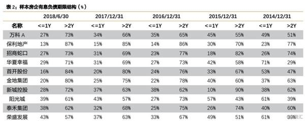 从期限结构来看,保利、滨江、首开的中长期有息负债占比较大,在有息负债中占比不超过20%,而迪马股份、光明地产、荣盛发展短期债务占比较高。