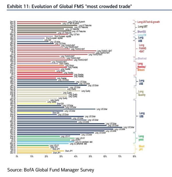 调查还显示,12月最“拥挤”的交易是:第一是美国科技和成长类股,第二是美国国债,第三是长期投资级企业债。