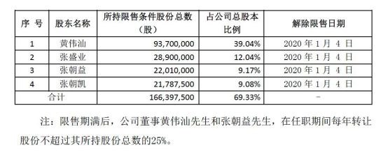 其中,美联新材实控人、董事长黄伟汕届时将有9370万股上市流通,占公司总股本的39.04%,解禁时间为2020年1月4日。