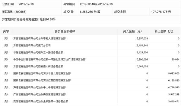 盘面上,12月18日,美联新材截至收盘再度涨停,录得三连板。盘后数据显示,游资博弈明显,买一席位方正证券台州市府大道净买入1596万元,卖一席位国泰君安证券深圳华强北路净卖出869万元。