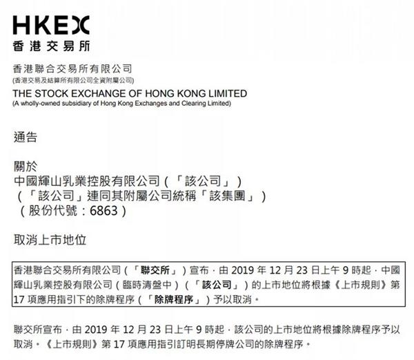 12月18日晚间,辉山乳业(06863.HK)发布公告称,公司被港交所取消上市地位,即强制退市。